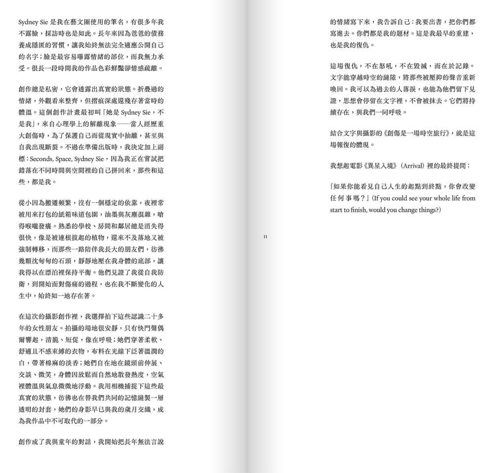 Sydney 在第一本書的最後,找來自小一起成長的女性友人,以獨特的影像語彙解構對女性身體的凝視,在畫面中刻意製造視覺錯視,再現性別與權利結構性的不對等,試圖翻轉攝影長年以來隱含的父權視角與陽剛觀看方式。她在攝影集裡以女性作為主體,重新打撈、拼貼「時間,空間,我」的全貌。