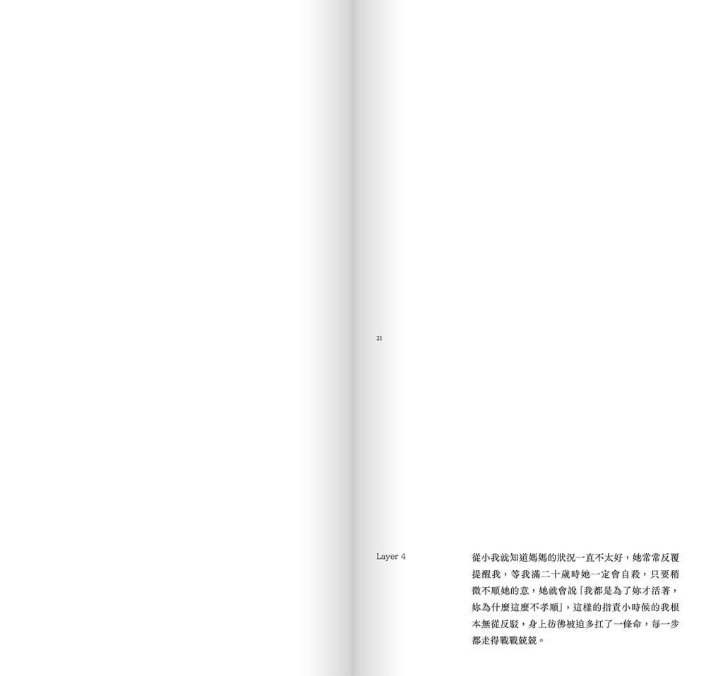 長大後我才知道,不只是媽媽,她的兄弟姊妹大多都有憂鬱症或雙向情感障礙,在表兄弟姊妹之間也很普遍,家族裡有許多人因此選擇離開這個世界。媽媽這一輩子承受了太多難以想像的事,直到現在,跟她相處仍然會感受到強大的壓力。對,很「幸運」地,她沒有在我二十歲生日那年真的自殺,即使之後還有許多次的自殺未遂。
