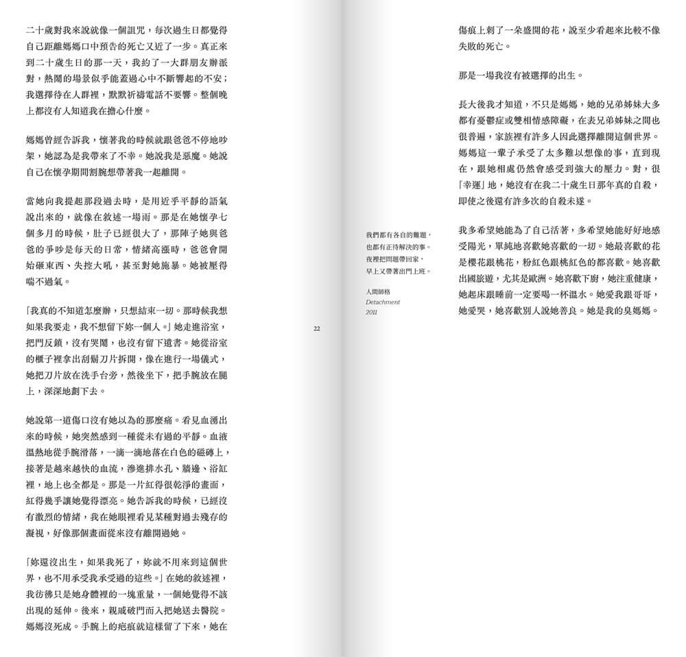 「我真的不知道怎麼辦,只想結束一切。那時候我想如果我要走,我不想留下妳一個人。」她走進浴室,把門反鎖,沒有哭鬧,也沒有留下遺書。她從浴室的櫃子裡拿出刮鬍刀片拆開,像在進行一場儀式,她把刀片放在洗手台旁,然後坐下,把手腕放在腿上,深深地劃下去。