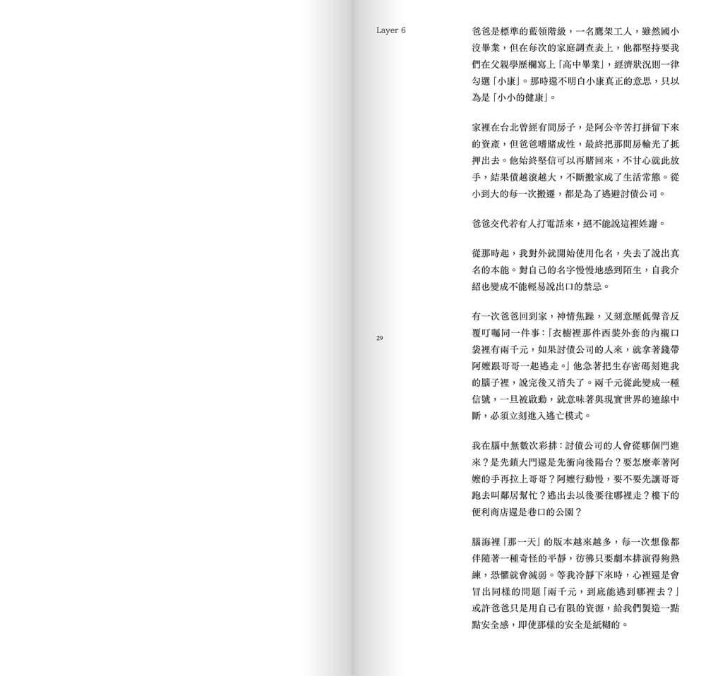 有一次爸爸回到家,神情焦躁,又刻意壓低聲音反覆叮囑同一件事:「衣櫥裡那件西裝外套的內襯口袋裡有兩千元,如果討債公司的人來,就拿著錢帶阿嬤跟哥哥一起逃走。」他急著把生存密碼刻進我的腦子裡,說完後又消失了。兩千元從此變成一種信號,一旦被啟動,就意味著與現實世界的連線中斷,必須立刻進入逃亡模式。