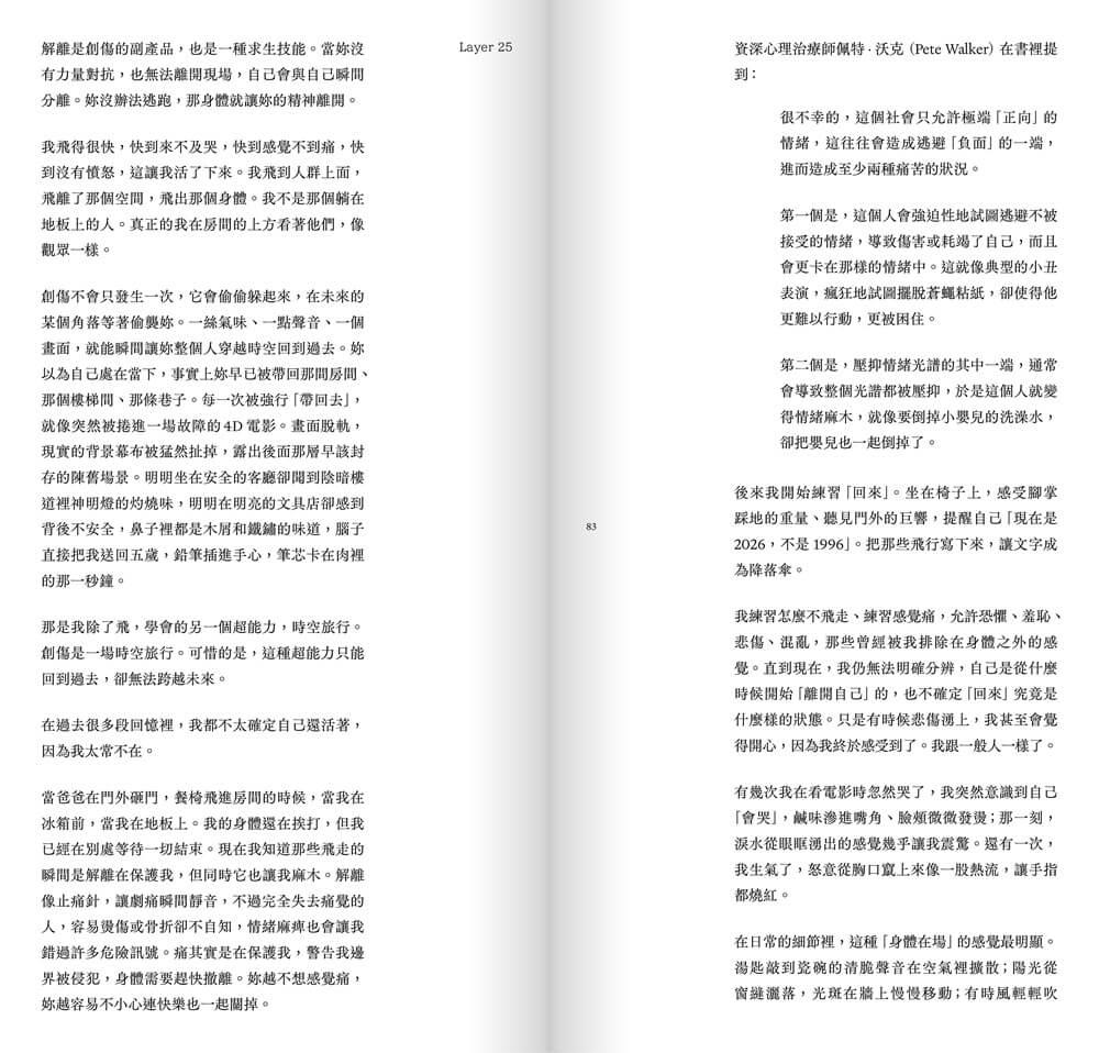 我練習怎麼不飛走、練習感覺痛,允許恐懼、羞恥、悲傷、混亂,那些曾經被我排除在身體之外的感覺。直到現在,我仍無法明確分辨,自己是從什麼時候開始「離開自己」的,也不確定「回來」究竟是什麼樣的狀態。只是有時候悲傷湧上,我甚至會覺得開心,因為我終於感受到了。我跟一般人一樣了。