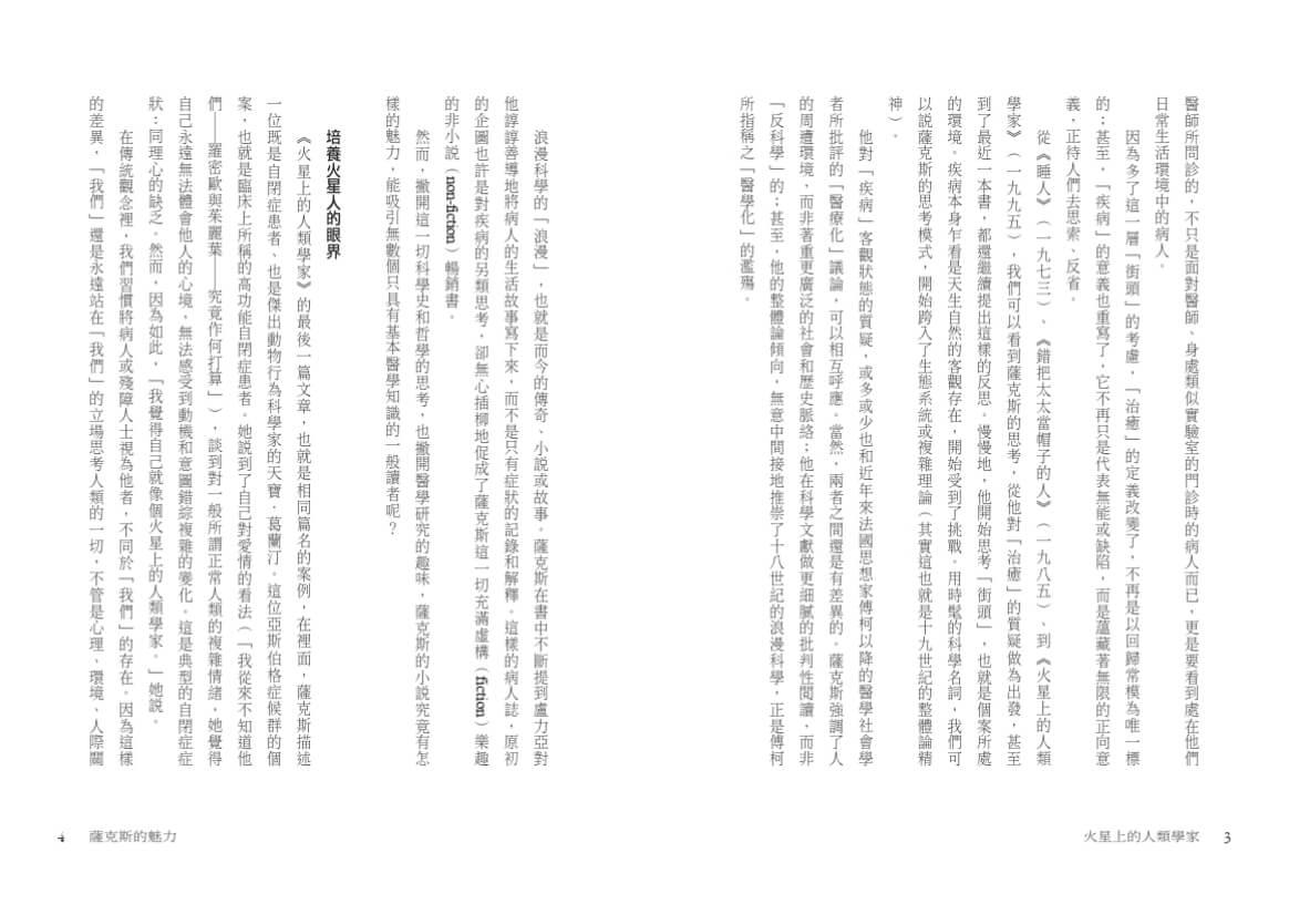 心中懷著這個想法,我已脫下白外套,離開了過去服務二十五年的醫院,到病患真正生活的世界,去探究他們的生命,覺得自己有點像博物學家,仔細檢查稀有的生命形態;也覺得自己有點像人類學家,也就是這個領域裡的神經人類學家——但是我仍然最像一名醫生,為病患從這一家奔走到另一家,奔向人類經驗遙遠的邊界。