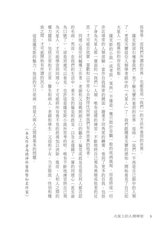作為一名在心智邊緣地帶永不停止探索的旅人,薩克斯以精鍊而不濫情的散文,呈現七位病患的故事。內容豐富、生動且引人入勝,足以媲美任何一部短篇小說集。——《週日獨立報》