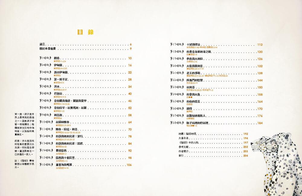 本書依聖經章節為序,屏除艱澀的寫法和用語,以抒情的故事體裁忠實重現《舊約聖經》的描寫,從創世開始,一篇篇關於伊甸園、亞當與夏娃、該隱與亞伯、諾亞的方舟與洪水、摩西出埃及、先知亞伯拉罕、巴別塔的建造、大衛和歌利亞、十災等膾炙人口的故事,以及其他一般讀者不一定聽過,但同樣精采且重要的情節,包括約拿與大魚、被丟進獅子坑的但以理,總計28篇,搭配融合經文中的資訊與歷史考據的精美插圖,絕對令人難以忘懷。